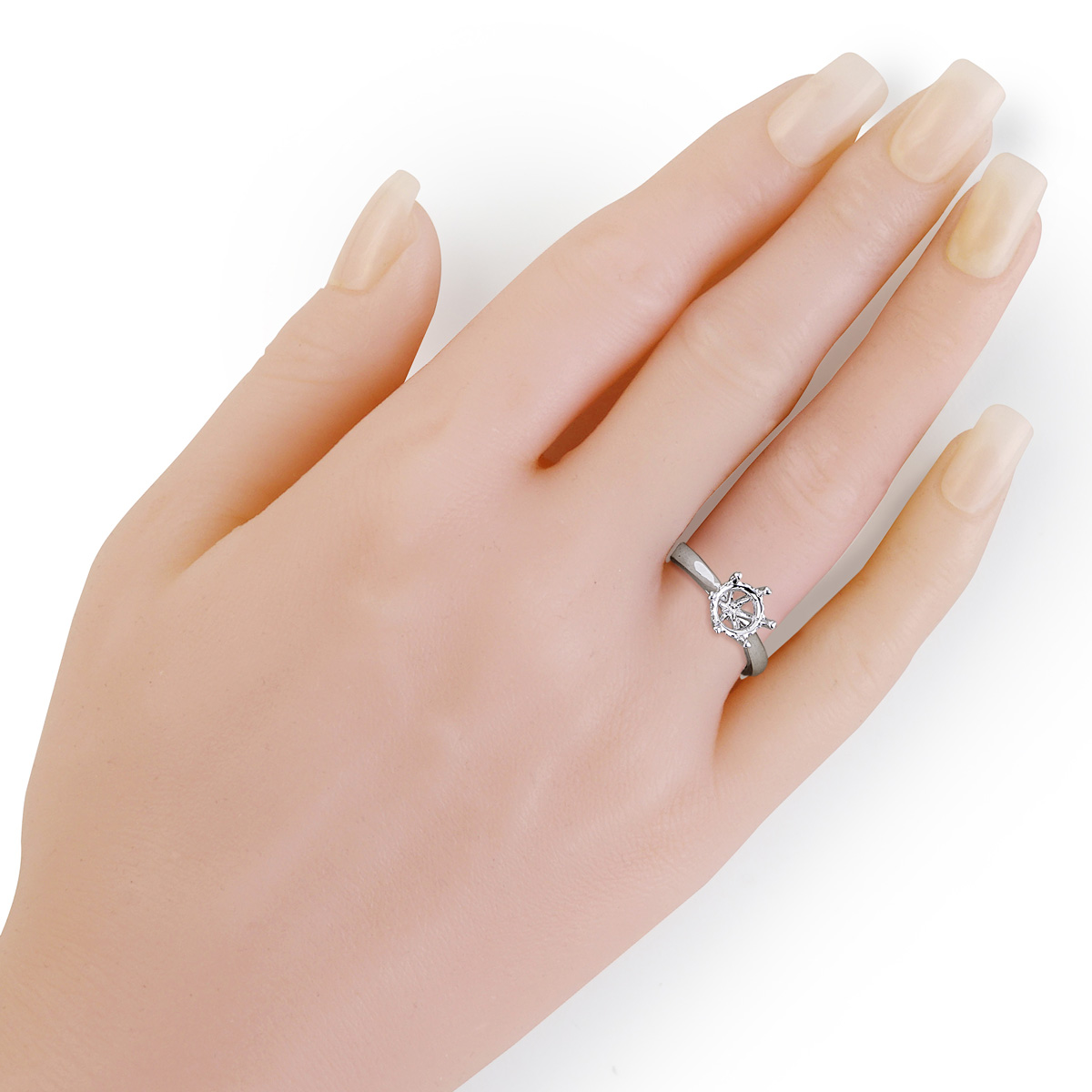 This setting is made of 14K white gold and weighs 2.6 DWT (approx. 4.04 grams). It contains 12 round G color and VS2-SI1 clarity diamonds weighing 0.07 CTTW. This setting is made for an approx. 7.4mm round diamond.