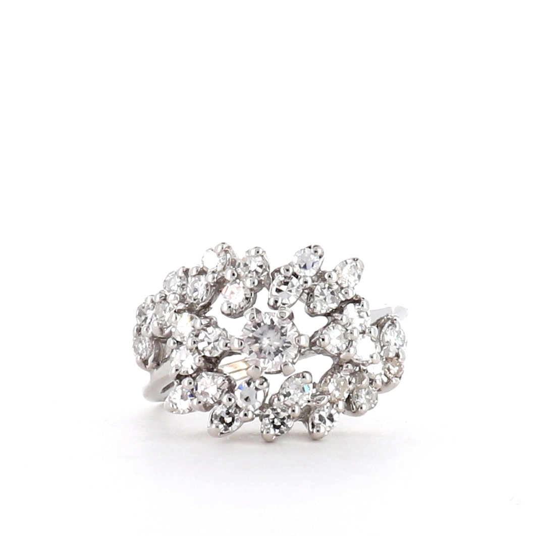 This New York Jewelers cocktail ring is made of 14K white gold and weighs 3.10 DWT (approx. 4.82 grams). It contains one round g color, SI clarity diamond weighing 0.20 CTTW, 30 single cut G-H color and SI clarity diamonds weighing 1.00 CTTW.