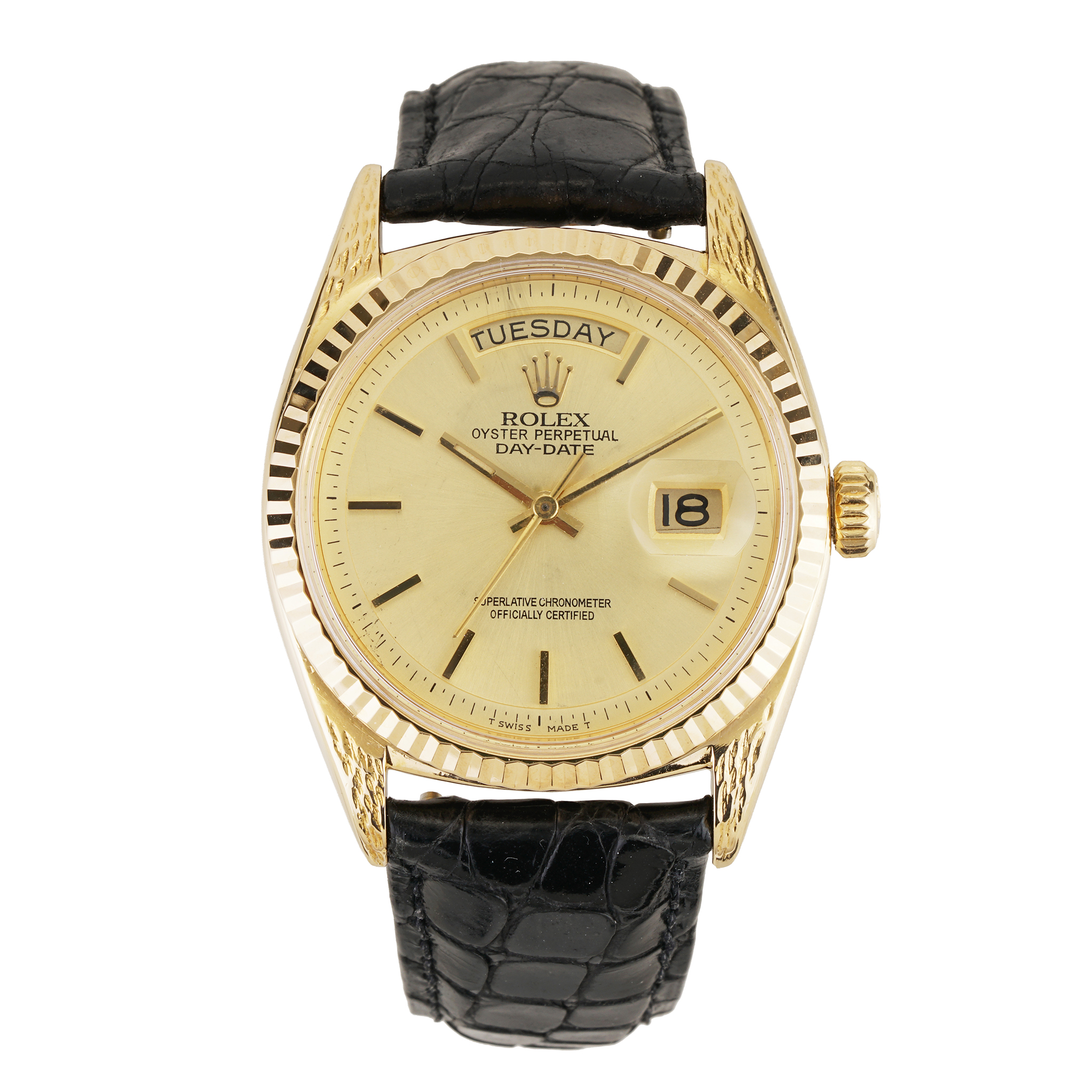 This Rolex President watch is made of 18k yellow gold. The 36 mm case houses a automatic movement and comes on a black leather strap. The gold index dial features a day and date indicator, a screw-down crown, and a chronometer.