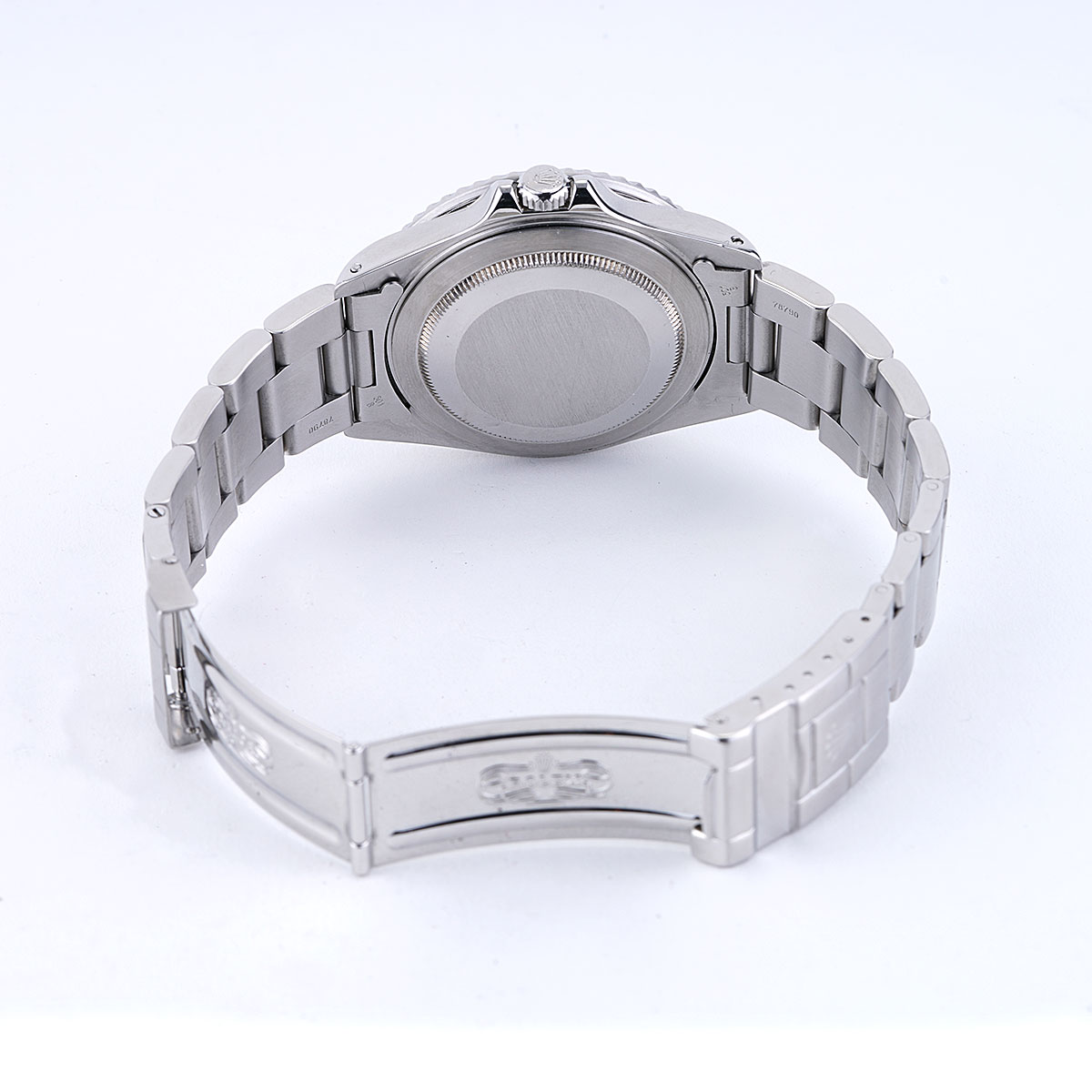 This Rolex Submariner watch is made of stainless steel. THe 40 mm case houses an automatic movement. The Black and red bezel show a GMT function. 8 inch overall length