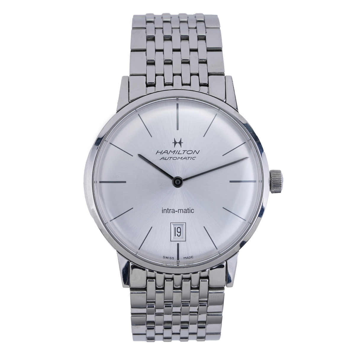 The 38mm diameter case houses an automatic movement, while the silver dial features Index markers. It comes on a stainless steel link bracelet. Its features include a date indicator and an exhibition caseback.
