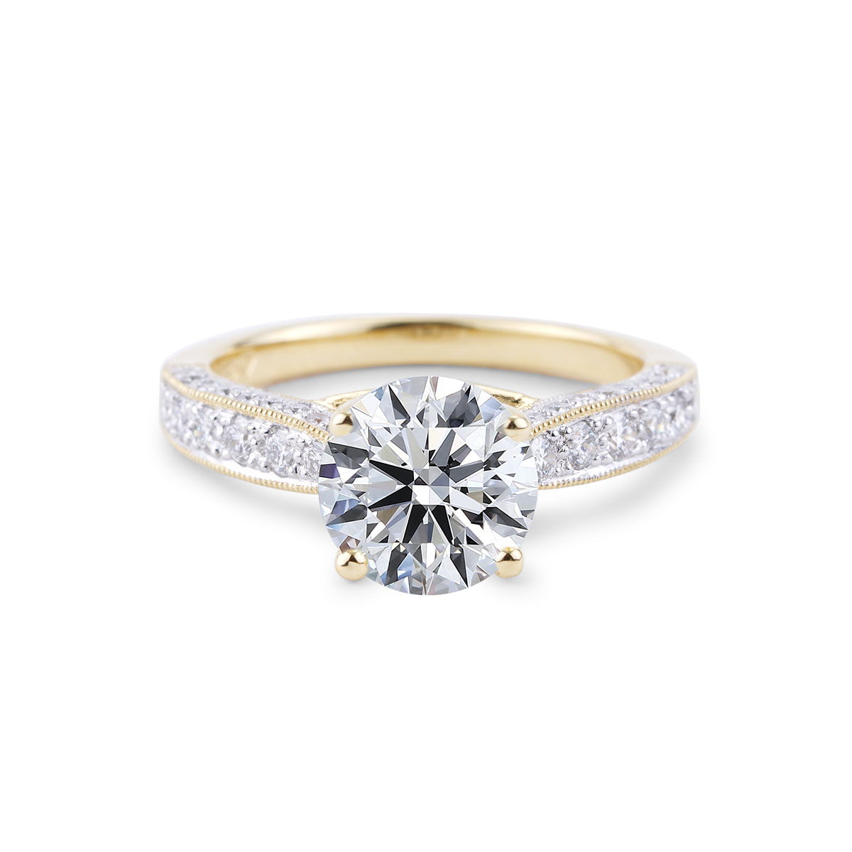 Three Sided Dimaond Cathedral Setting for a 1.25 CT Round Center Diamond in Yellow Gold