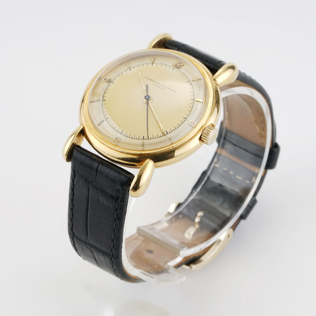 The 32mm diameter case houses a manual movement, while the silver dial features index markers. It comes on a black leather strap with a tang buckle. Circa 1940's.