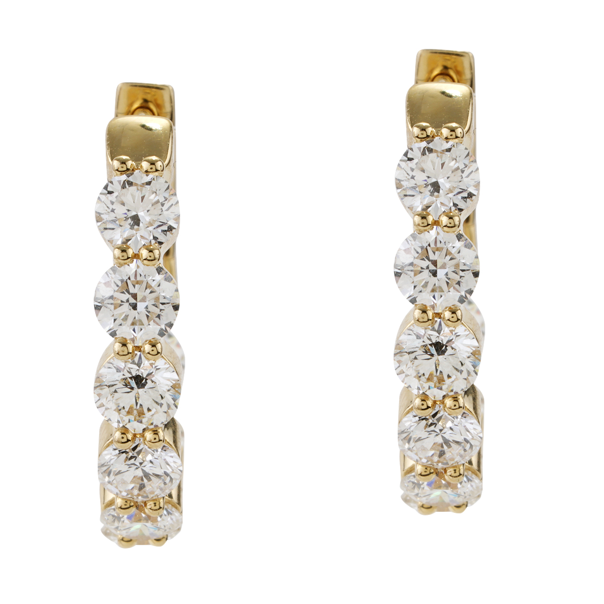 These earrings are made of 18K yellow gold and weigh 5.0 DWT (approx. 7.78 grams). They contain 16 round G color, VS clarity diamonds weighing 3.35 CTTW.