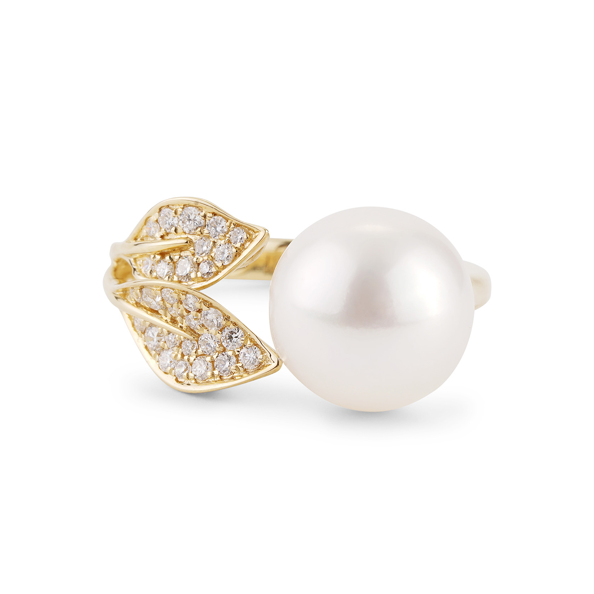 11 MM South Sea Pearl and Diamond Leaf Motif Ring Yellow Gold