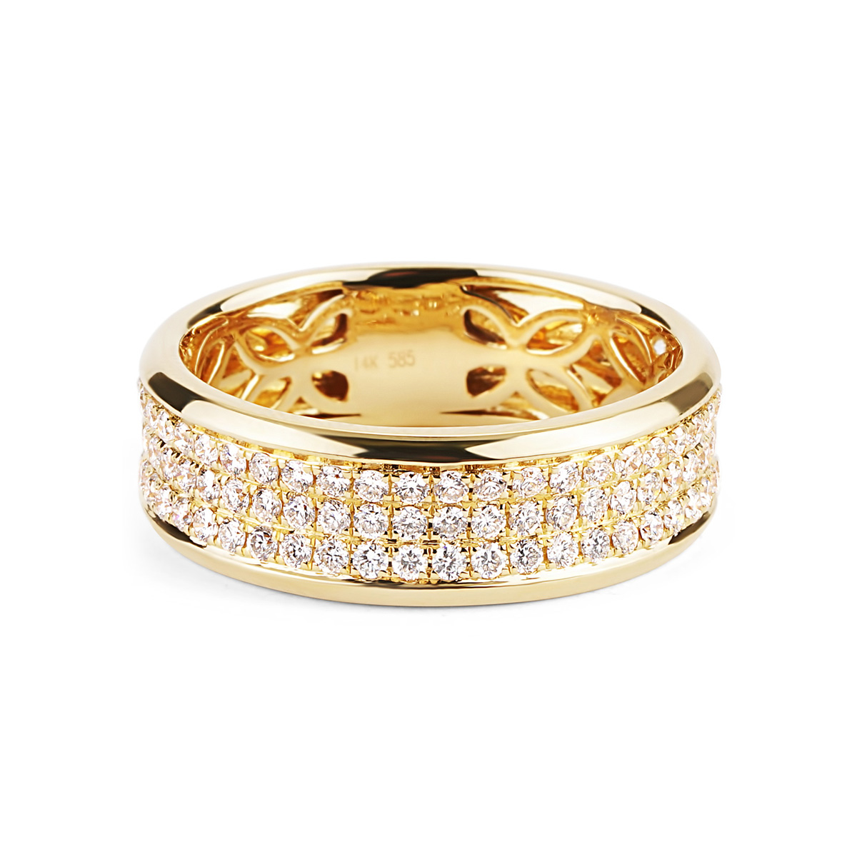 This band is made of 14K yellow gold and weighs 4.2 DWT (approx. 6.53 grams). It contains 93 round G color, VS2-SI1 clarity diamonds weighing 1.12 CTTW.