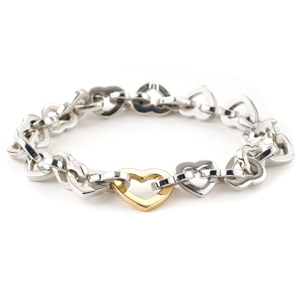 This Tiffany & Co. Open Heart link bracelet is 8 inches in length and weighs 23.9 DWT (approx. 37.17 grams). It is made of 925 Silver and 18K yellow gold.