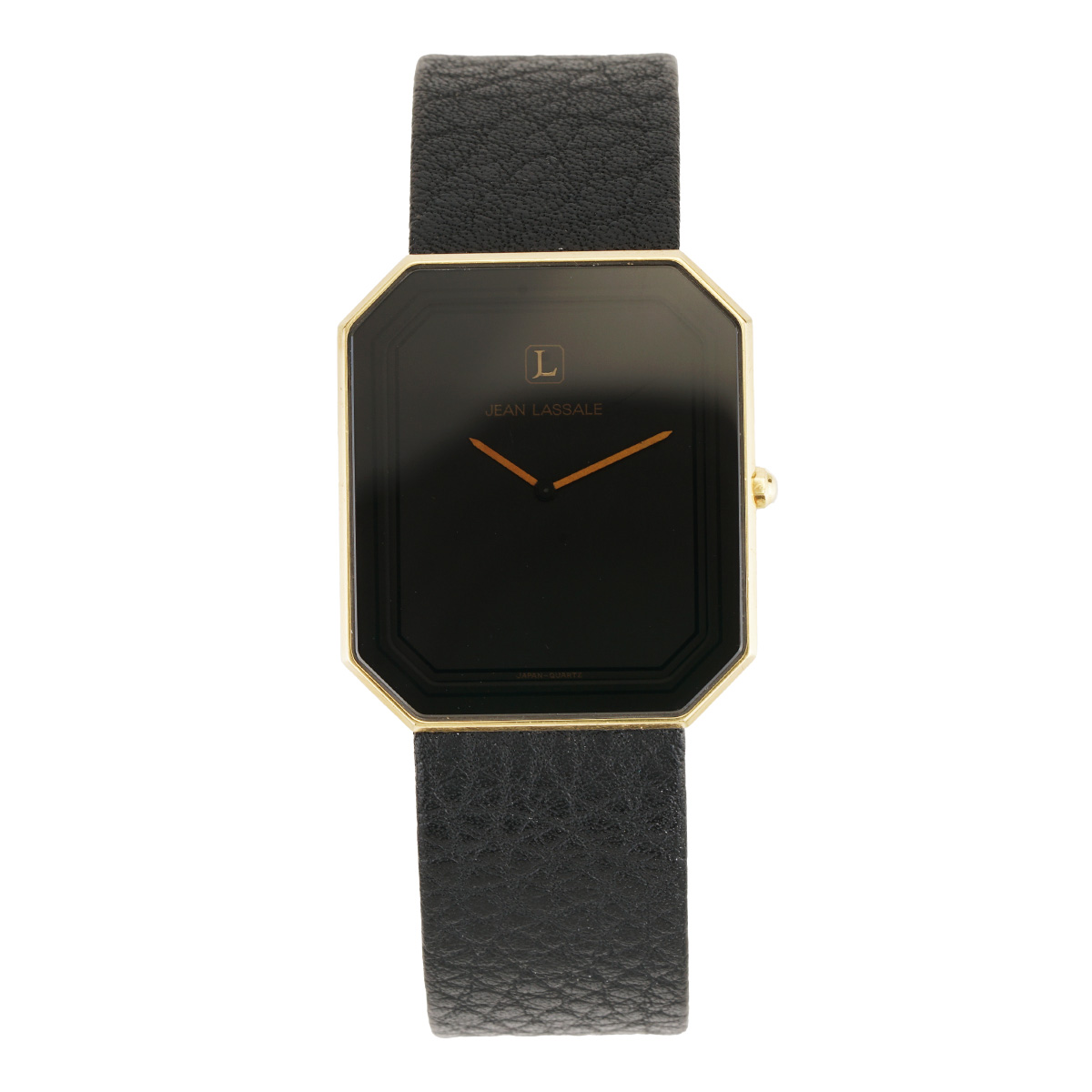 This Lassale Dress watch is made of 18K yellow gold. The 27x31mm diameter case houses a quartz movement and a black dial. It comes on a black leather strap with a fold over clasp.
