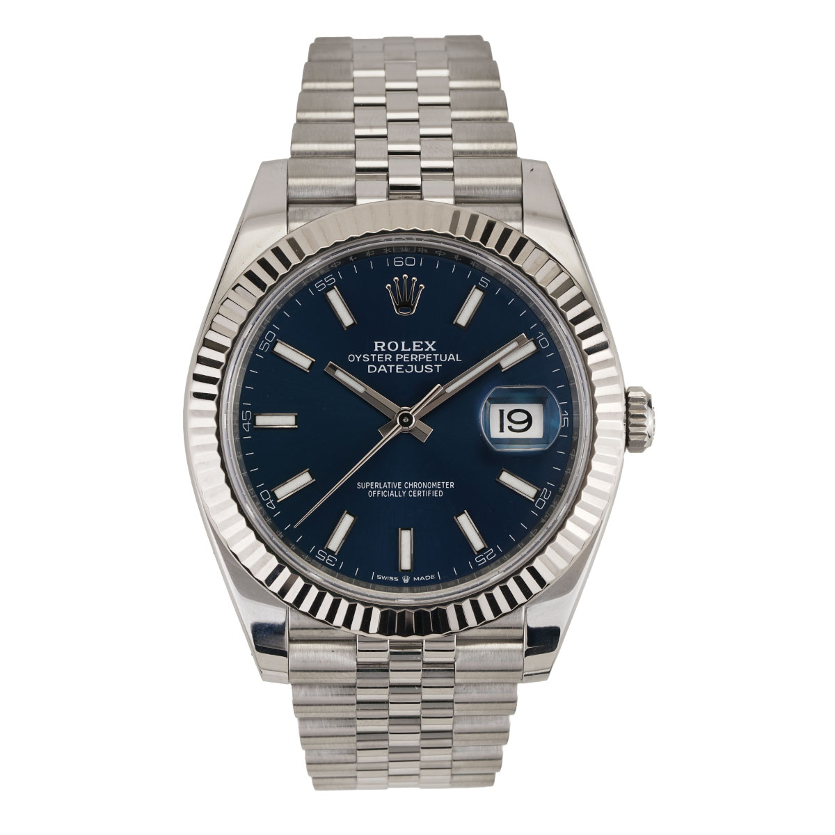 This Rolex Datejust watch is made of stainless steel. The 41 mm case houses an automatic movement, and comes on a steel jubilee-style bracelet along with a fluted bezel. The blue dial features luminescent index markers, a date indicator, a screw-down crown, and a chronometer. Circa 2024.