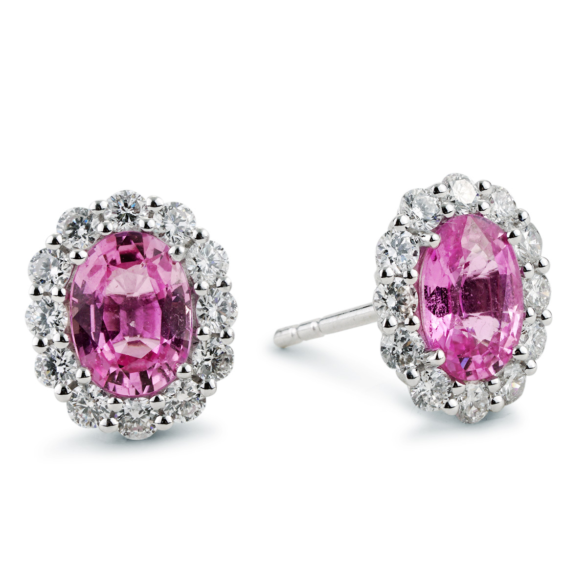 2.61 CTTW Oval Pink Sapphire and Diamond Halo Stud Earrings White Gold