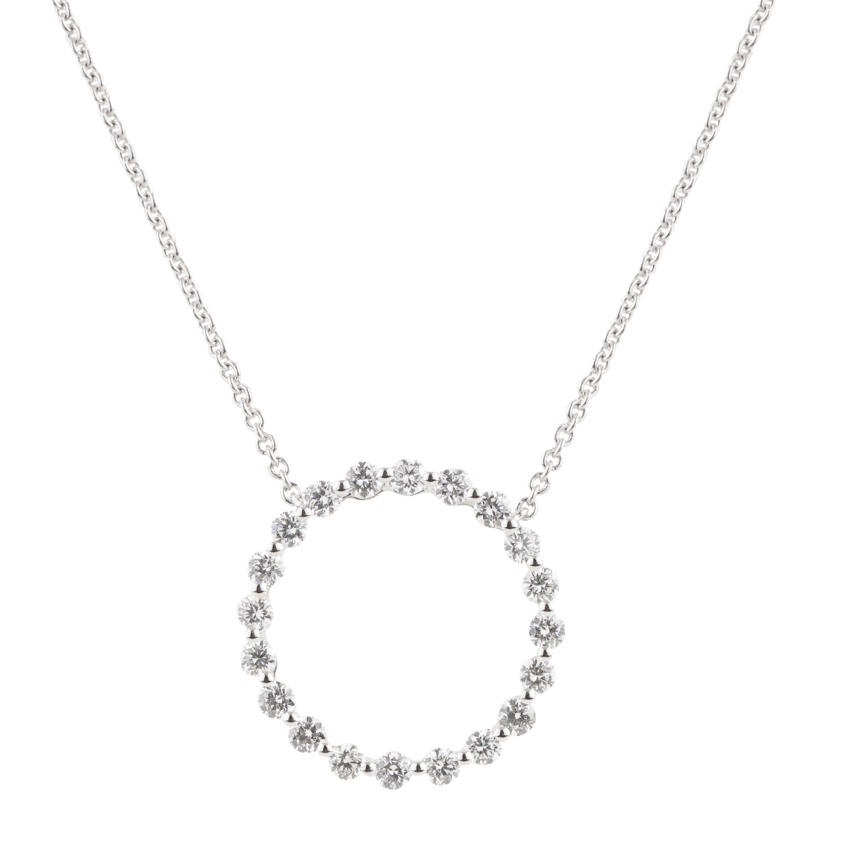 This necklace is 16.5 inches in length, made of 18K white gold, and weighs 2.6 DWT (approx. 4.04 grams). It contains 20 round G color, VS clarity diamonds weighing 0.79 CTTW.