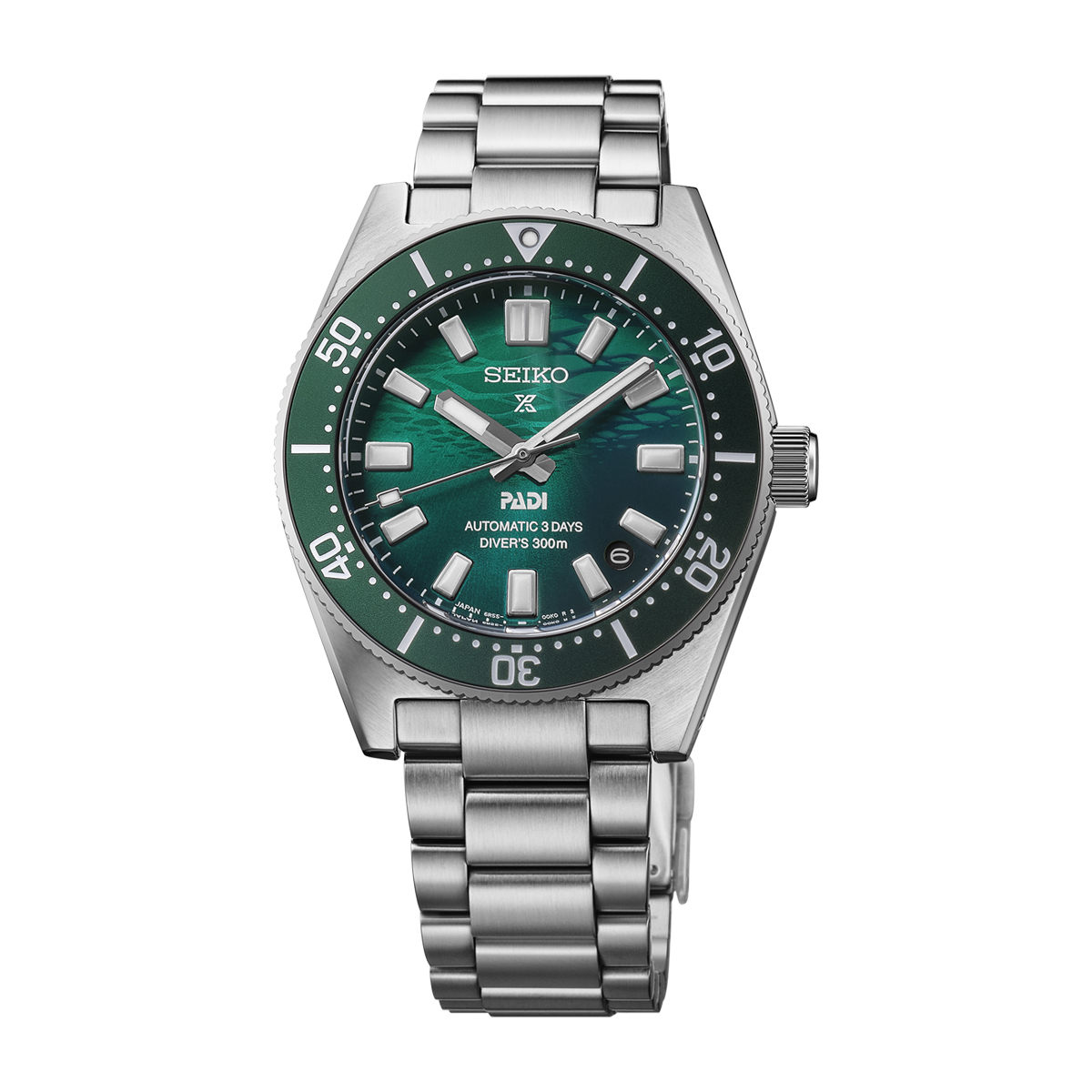 Prospex 1965 Heritage Diver’s PADI Special Edition. Seiko Prospex challenges every limit with timepieces created to exceed expectations, engineered with superior style and innovative technology for the sea, sky or land. Driven by a rich legacy that has set the standard for dive watch specifications and a heritage of iconic design, Prospex continues to keep going forward with precision timekeeping, crafted for the modern world. This exciting Special Edition celebrates Seiko’s first diver’s watch and the ongoing partnership with PADI, beautifully displaying a vibrant green patterned dial, reflecting the underwater view of waves on the ocean surface illuminated by sunlight. Framed by a coordinating uni-directional rotating elapsed timing bezel, the eye-catching dial offers a date calendar between 4 and 5 o’clock allowing for LumiBrite coating on the hands and all 12 markers, improving symmetry and legibility. With an impressive power reserve of approximately 72 hours, 3 full days, the 24-jewel automatic movement beats at a frequency of 21,600 vibrations per hour with manual winding capability. Crafted of stainless steel with super-hard coating, this superbly functional timepiece includes a curved sapphire crystal with anti-reflective coating on the inner surface, as well as a screwdown crown and caseback. Following ISO standards for scuba diving to depths of up to 300 meters, the innovative creation preserves a streamlined case profile while incorporating a sleek bracelet equipped with a specially developed slide adjuster clasp with a double lock, allowing for easy size adjustment. Highlighting Seiko’s conservation efforts in collaboration with PADI, the Special Edition is presented with additional green fabric diver’s strap made from 100% recycled plastic bottles, braided with the traditional Japanese Seichu technique for exceptional strength. 300m Water Resistant