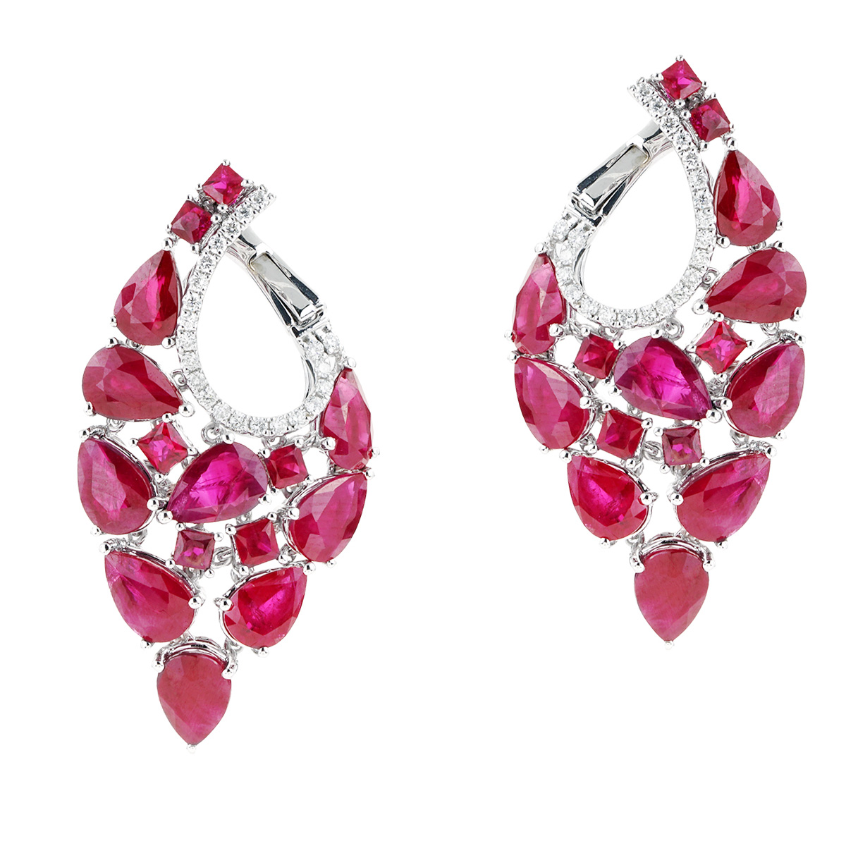 These one-of-a-kind mixed shapes ruby and diamond earrings are made of 18K white gold and weigh 4.9 DWT (approx. 7.62 grams). They contain 30 mixed shape rubies weighing 10.46 CTTW and 44 round G color, VS2-SI1 clarity diamonds weighing 0.22 CTTW.