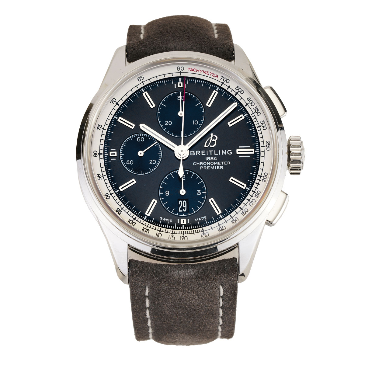 This Breitling Premier watch is made of stainless steel. The 42mm case houses an automatic movement, and comes on a gray suede leather strap. The black dial features a chronograph, a chronometer, a date indicator, a small-seconds, and a tachymeter.