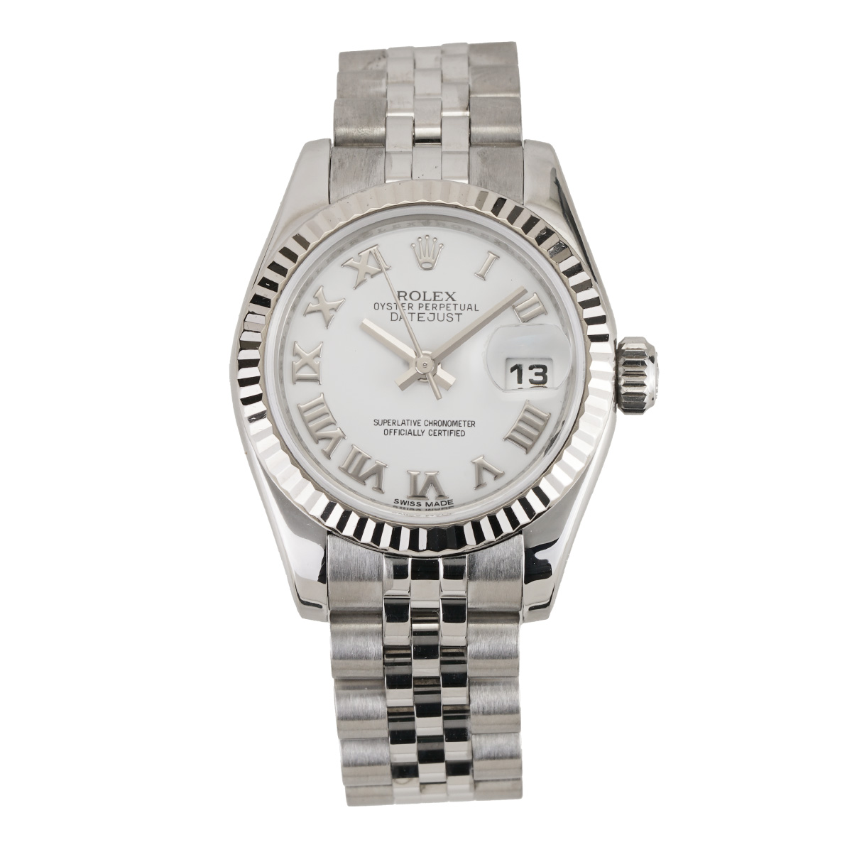 This Rolex Datejust watch is made of stainless steel and 18k white gold. The 26 mm case houses an automatic movement, and comes on a steel jubilee-style bracelet along with a fluted 18k white gold bezel. The white dial features Roman numeral markers, a date indicator, a screw-down crown and a chronometer. Circa 2013 approximately.