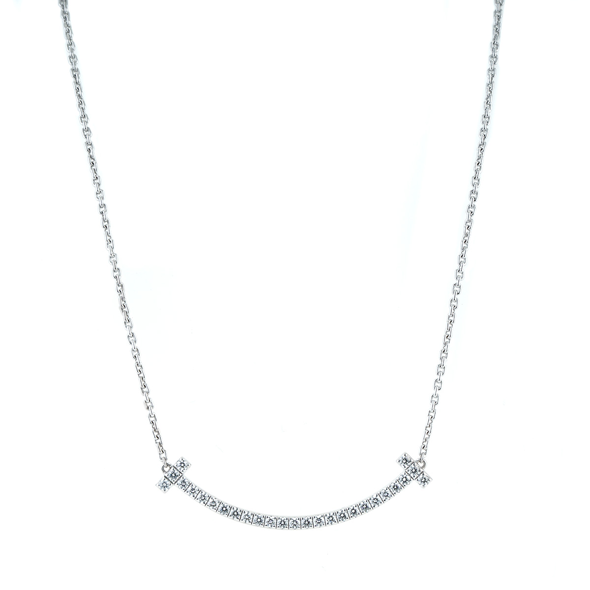 Previously-owned Tiffany & Co. Tiffany T Smile Collection necklace. The necklace is 16-18 inches in length, made of 18K white gold, and weighs 5.20 DWT (approx. 8.09 grams). It also has 27 round diamonds .48 CTTW.