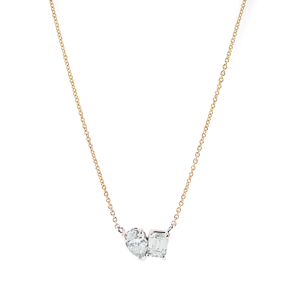 This necklace is 18 inches in length, made of 14K white gold, and weighs 1.2 DWT (approx. 1.87 grams). It contains one round G-H color, SI clarity diamond weighing 0.40 CTTW and one oval cut, G-H color, VS clarity diamond weighing 0.43 CTTW. The chain is adjustable.