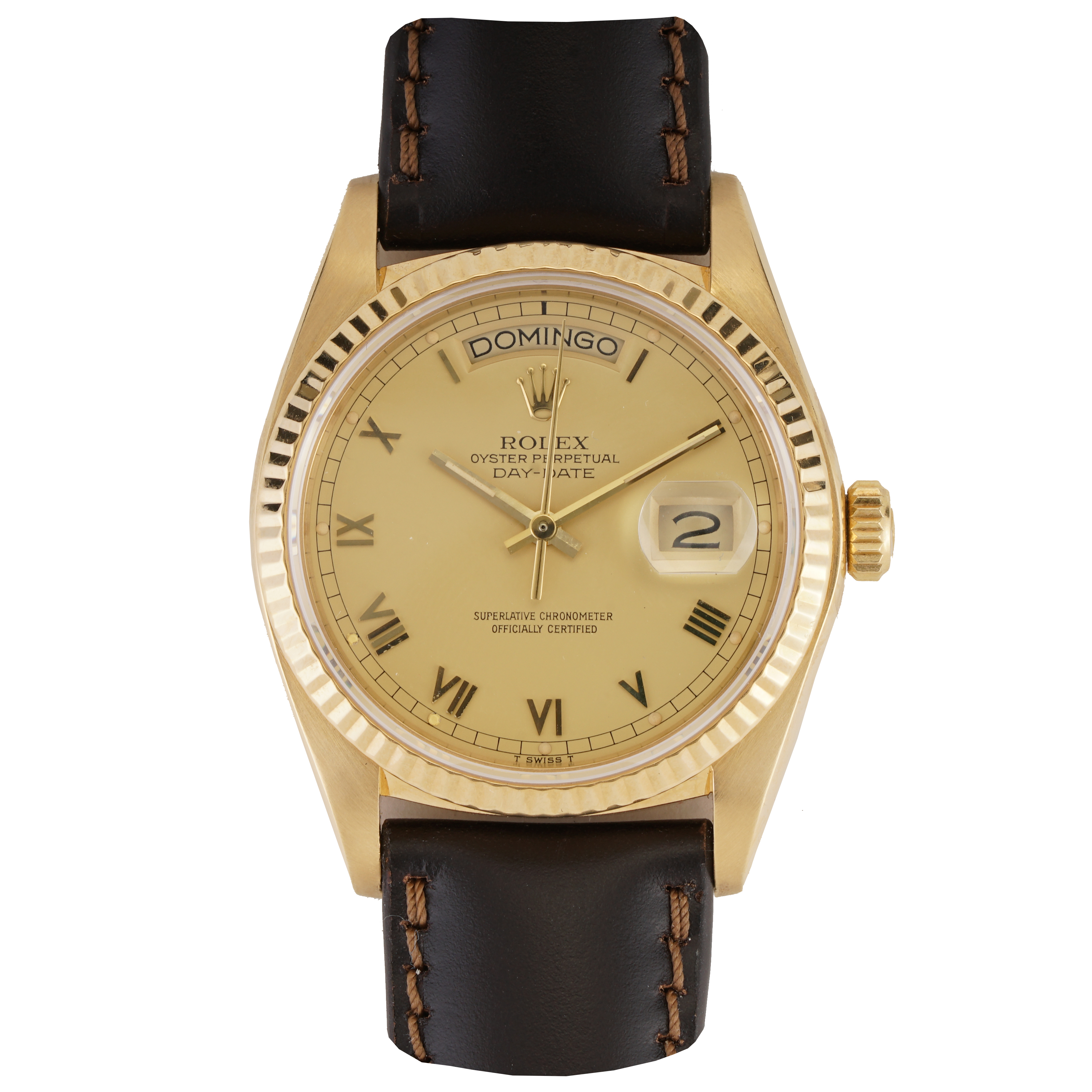 This Rolex Day Date watch is made of 18k yellow gold. The 36 mm case houses an automatic movement, and comes on a brown leather strap with a tang buckle. The gold dial features a Spanish day indicator, a date indicator, a screw-down crown, and a chronometer. Circa 1979.