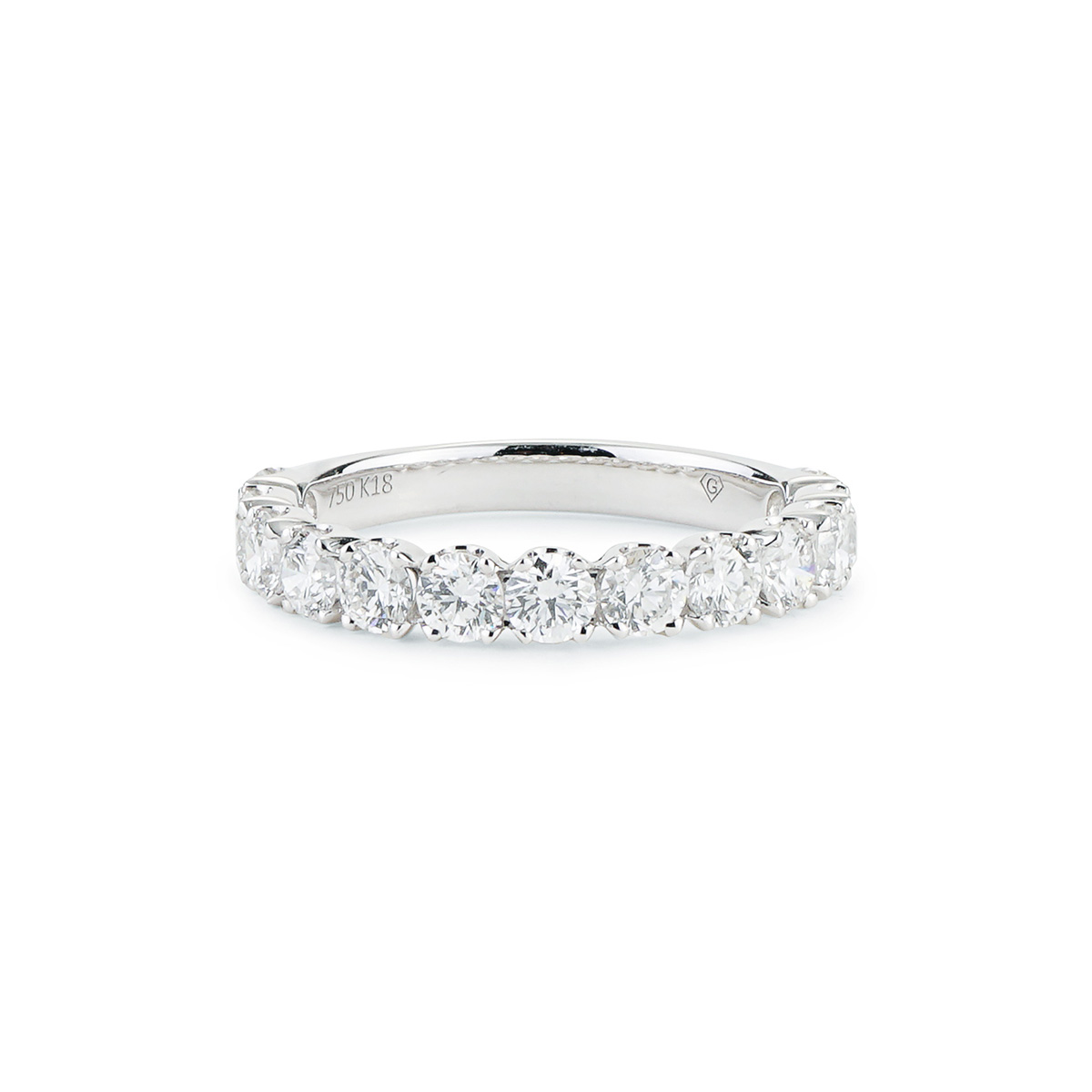 This band is made of 18K white gold and weighs 1.7 DWT (approx. 2.64 grams). It contains 13 round F color, VS clarity diamonds weighing 1.44 CTTW.