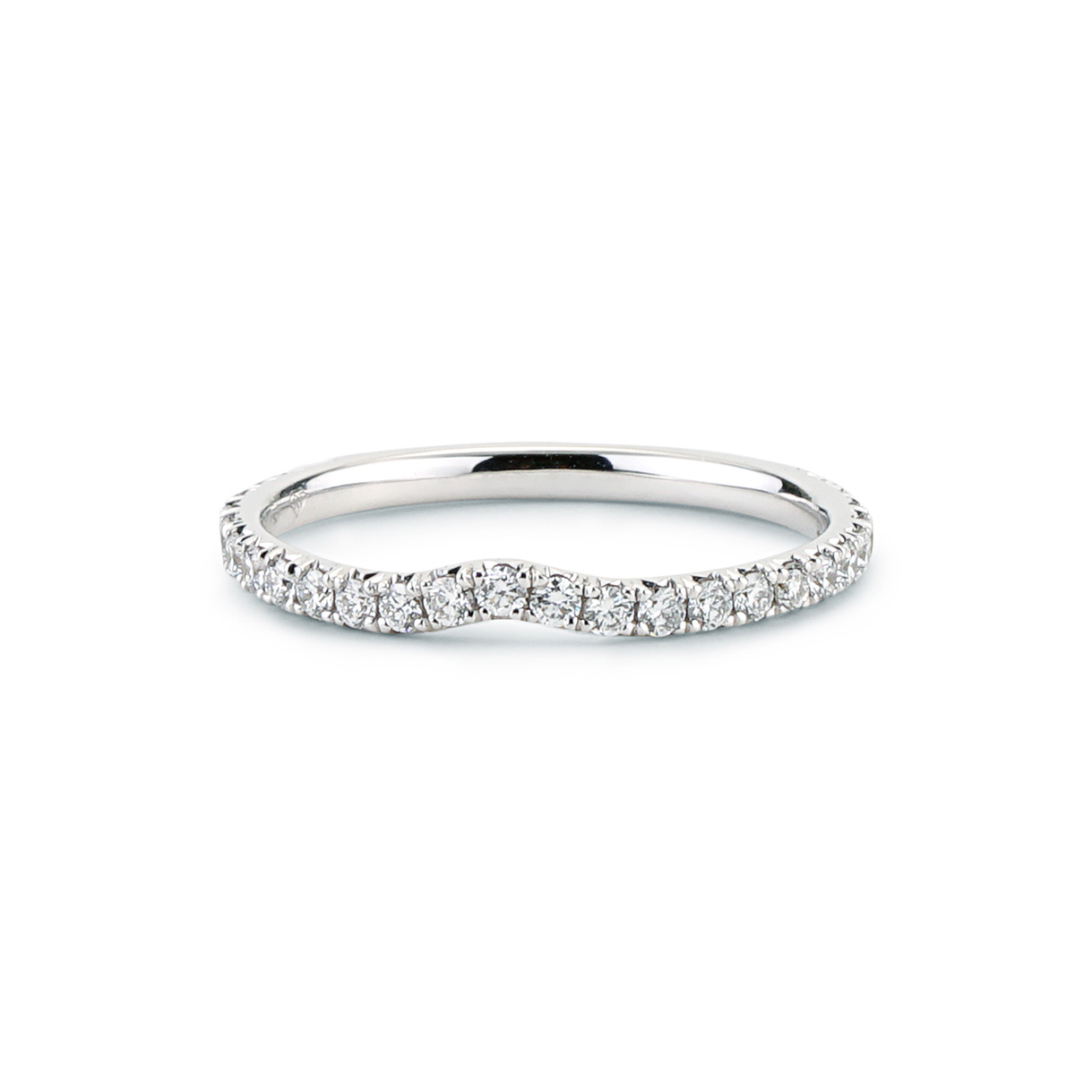 This wedding band is made of 18K white gold and weighs 0.9 DWT (approx. 1.4 grams). It contains 27 round G color, VS clarity diamonds weighing 0.39 CTTW.