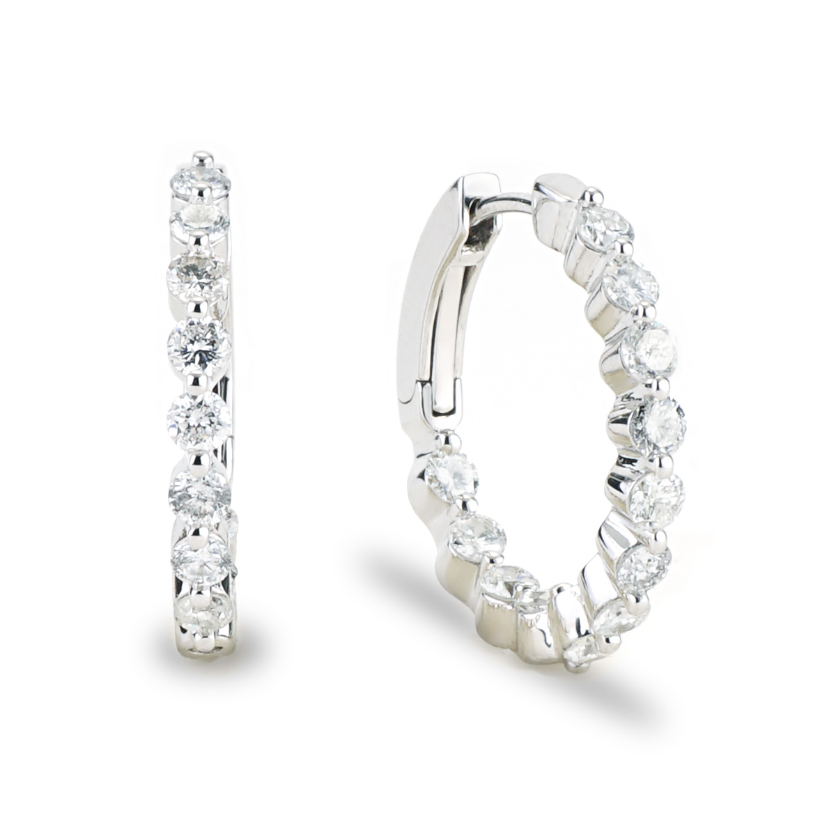 These hoop earrings are made of 14K white gold and weigh 3.2 DWT (approx. 4.98 grams). They contain 24 round G-H color, SI3-I1 clarity diamonds weighing 1.70 CTTW.