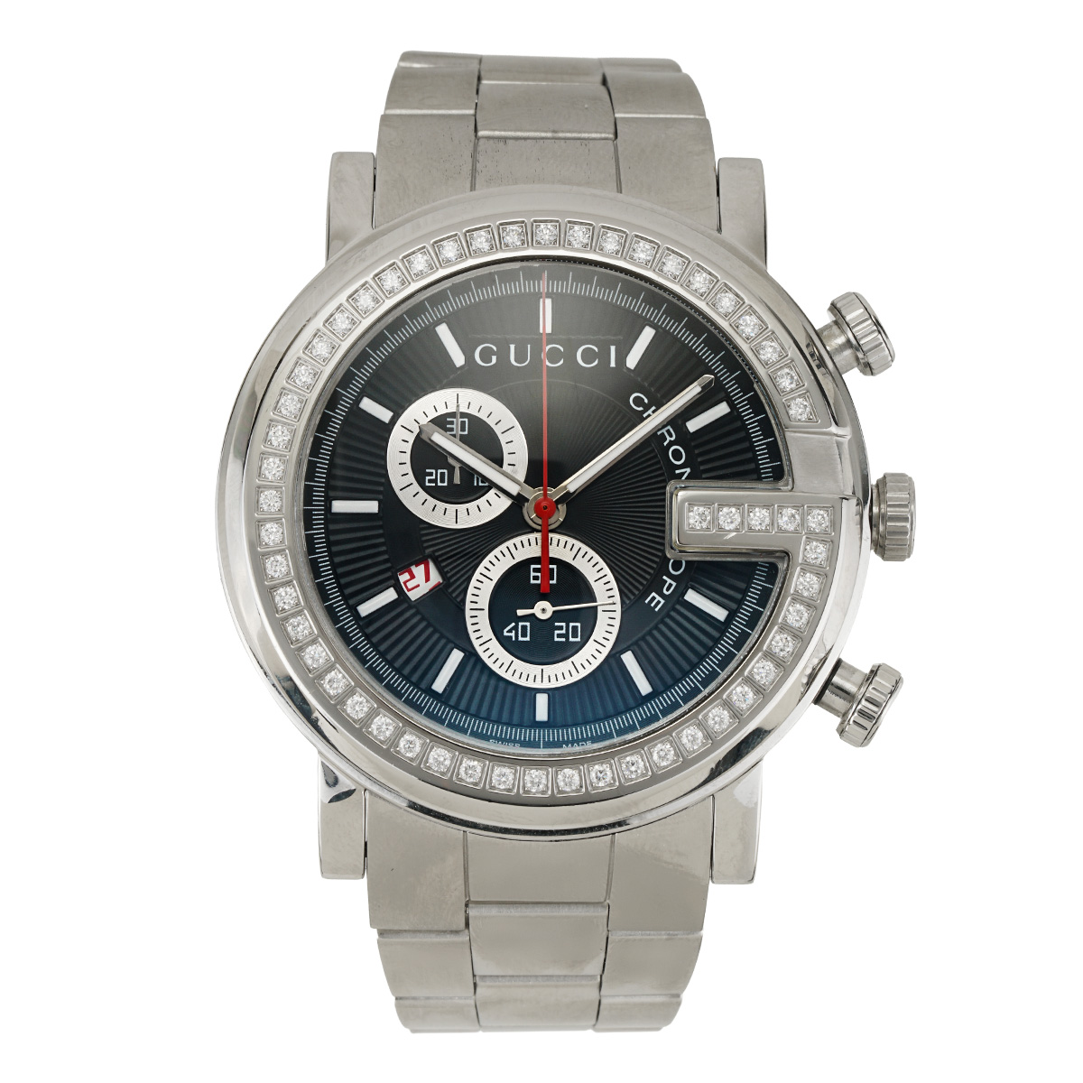 This Gucci G-Chronograph watch is made of stainless steel. The 44mm diameter case houses a quartz movement, while the black dial features index markers. It comes on a stainless steel link bracelet with a butterfly clasp. Its features include a chronograph and a date indicator.
