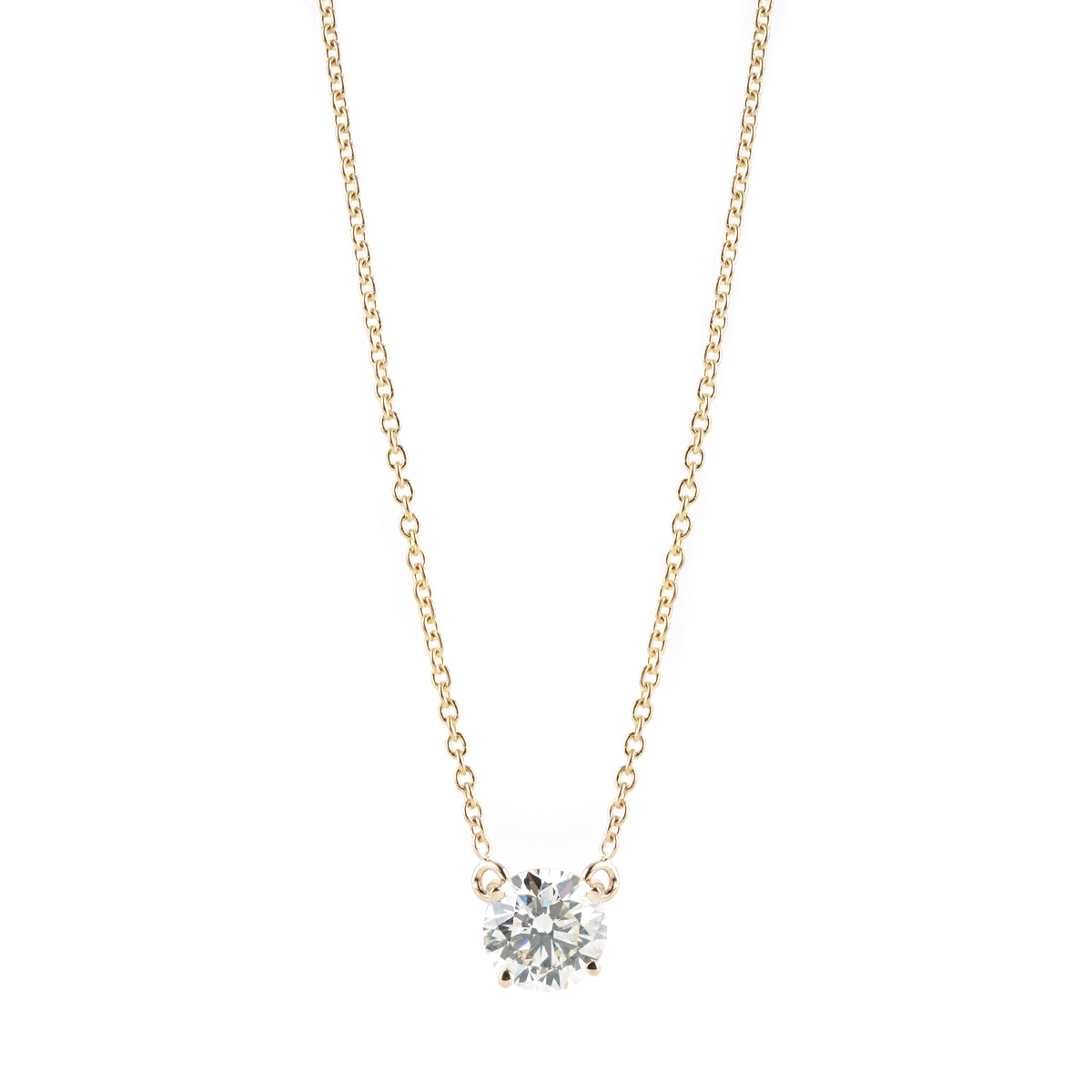 This GIA certified necklace is 18 inches in length, made of 14K yellow gold, and weighs 2.0 DWT (approx. 3.11 grams). It contains one round K color, VS1 clarity diamond weighing 1.51 CT. The chain is adjustable.