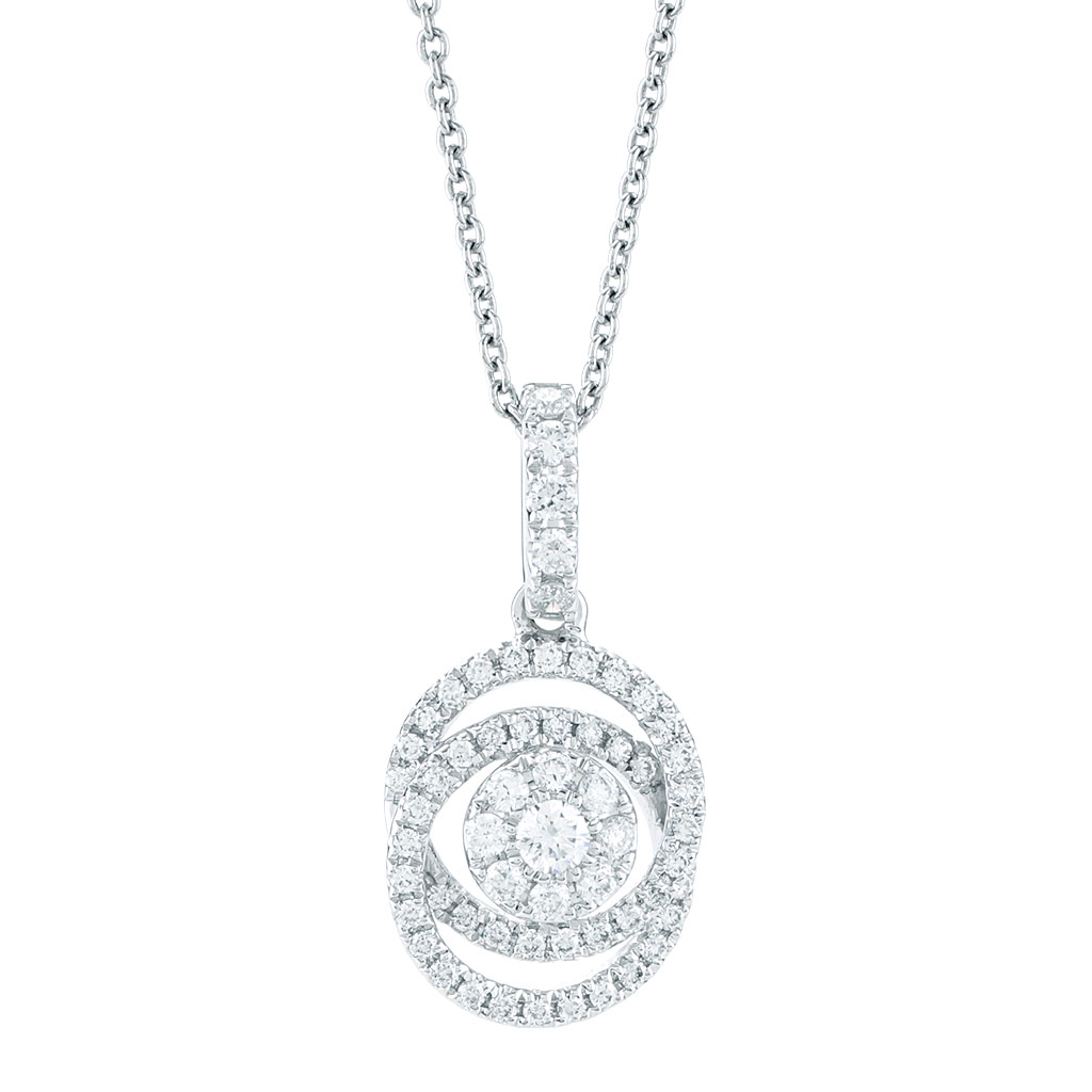 This diamond pendant is made of 14K white gold and weighs 0.7 DWT (approx. 1.09 grams). It contains 60 round G color and VS2-SI1 clarity diamonds weighing 0.25 CTTW.