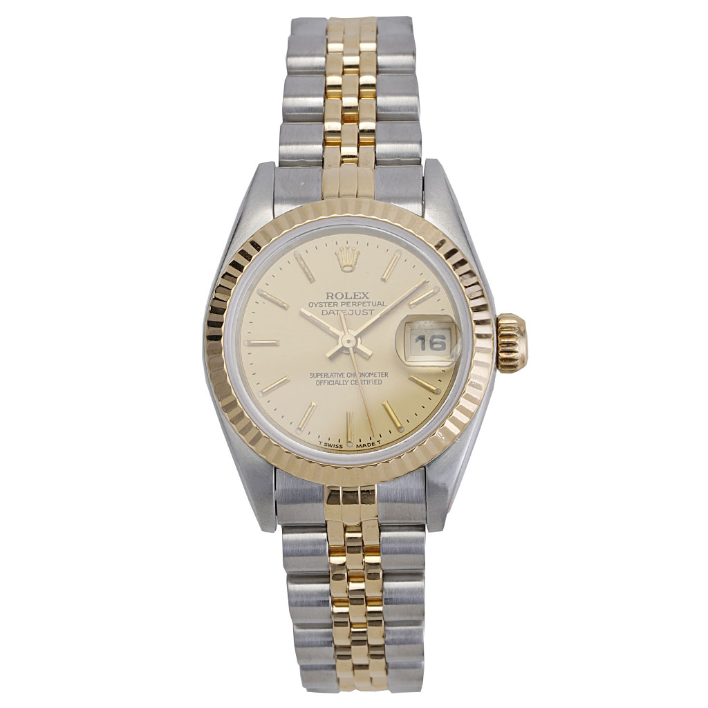 This pre-owned Rolex Datejust watch is made of 18K yellow gold and stainless steel. The 26 mm case houses an automatic movement and fluted bezel. The gold dial features a date indicator and index markers. The 6.5 inch Jubilee style band is made of 18K yellow gold and stainless steel.